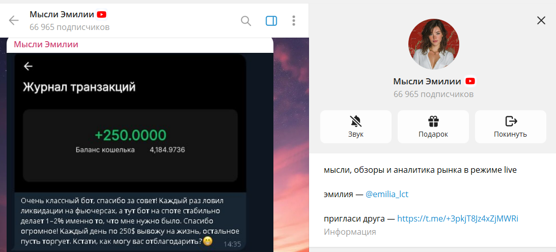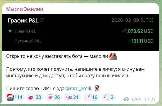Проект Мысли Эмилии позиционируется как площадка с идеями для торговли криптовалютой. В ленте регулярно появляются посты про фьючерсы. Автор выступает под ником @emilia_ict и ведет канал от первого лица. Подписчикам обещают понятные сигналы и быстрые результаты. Параллельно продвигаются дополнительные закрытые форматы. В целом это типичный «сигнальный» телеграм‑портал без прозрачной верификации.