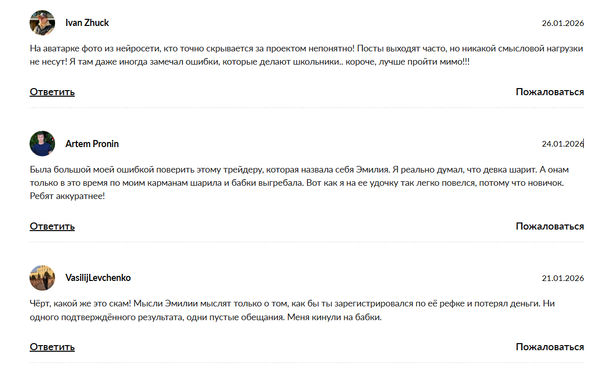 Подробной верифицированной отчетности по сделкам нет: в ленте обычно показываются удачные результаты, а проигрышные эпизоды могут не фиксироваться, из-за чего общая картина искажается. Скриншоты с торговых площадок без проверки на независимых сервисах ценности почти не имеют, поскольку легко подделываются или выборочно публикуются. Внутри проекта демонстрируются в основном позитивные комментарии, а на внешних площадках чаще встречаются жалобы и истории о финансовых потерях, что косвенно указывает на проблемы с качеством сигналов и честностью статистики: