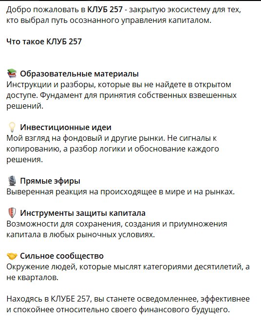 - Закрытый Telegram‑канал/сообщество по подписке. Приватный клуб 257 включает: