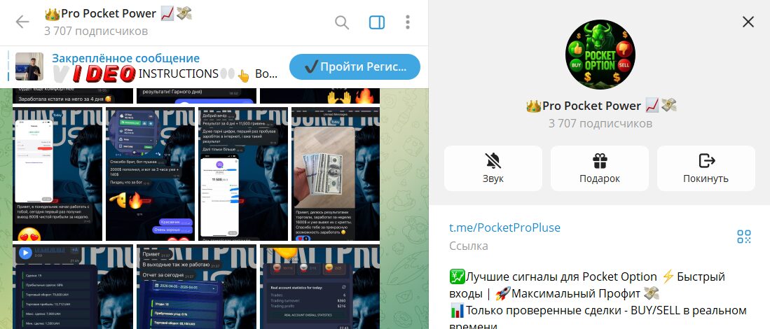 Проект Pro Pocket Power в Telegram продвигается как канал о заработке на бинарных опционах. В роли автора и «трейдера» выступает Мардан Рзаев с ником @Pizdec123. В ленте публикуются анонсы торговых сессий, итоги по сделкам и подборки положительных откликов. Основной акцент сделан не на обучении, а на участии в сессиях по сигналам. При этом почти в каждом посте встречаются призывы зарегистрироваться у конкретного брокера.