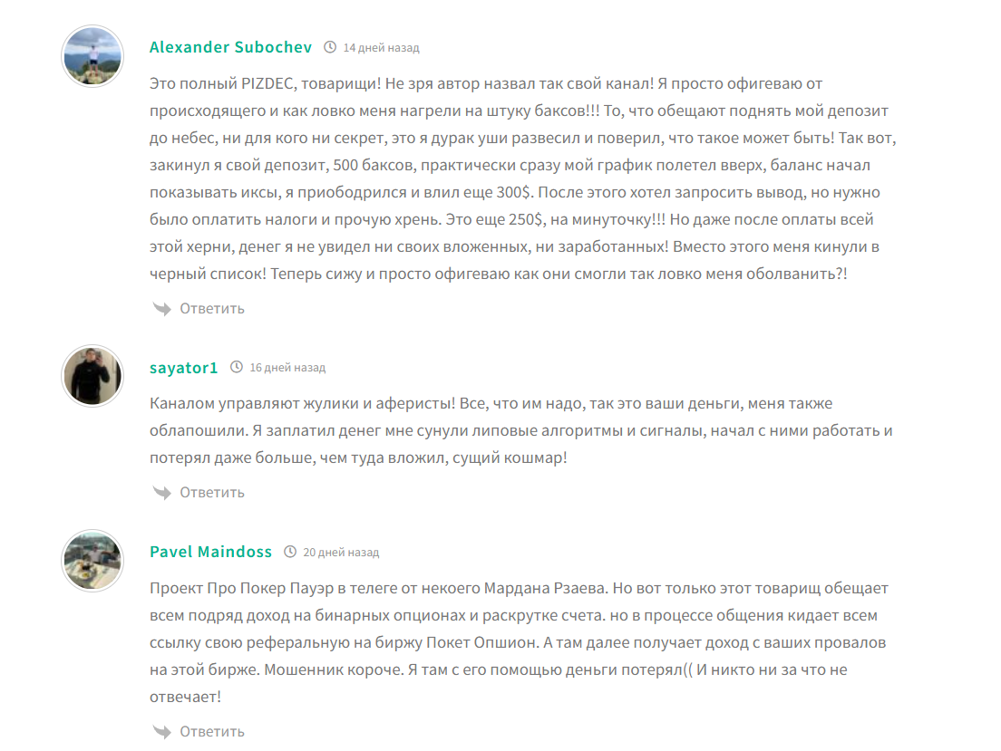 Внутренняя статистика в ленте подается в виде отчетов Мардана Рзаева, но верификации на независимых сервисах нет, а значит, данные нельзя проверить. Показательные «серии удачных входов» в бинарных опционах без подтверждения выглядят сомнительно, особенно при агрессивной манере торговли. В самом канале демонстрируются преимущественно позитивные отзывы, что естественно при полном контроле публикаций. На сторонних ресурсах чаще встречается противоположная тональность – жалобы, низкие оценки и тезисы о том, что заявленные результаты не соответствуют реальности: