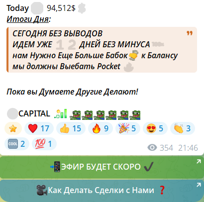 Основная деятельность канала – проведение торговых сессий по бинарным опционам и сбор аудитории в закрытый формат. Подписчикам предлагают следовать сигналам «как есть», без полноценного обучения, объяснения логики входов и риск-менеджмента. После торгов публикуют краткие итоги и скриншоты «успехов», а также демонстрируют переписки с довольными участниками VIP. Параллельно регулярно размещаются ссылки и инструкции, связанные с регистрацией у рекламируемой платформы.