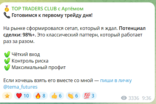 О новых торговых сессиях на канале TOP TRADERS CLUB с Артемом сообщают заранее. Чтобы получить доступ к прогнозам и условиям сотрудничества, предлагают написать напрямую трейдеру @tema_futures. Отдельной фиксированной «цены входа» в описании не фигурирует. Вместо оплаты вперед используется схема раздела результата. При закрытии сделки в плюс нужно отдать половину прибыли: