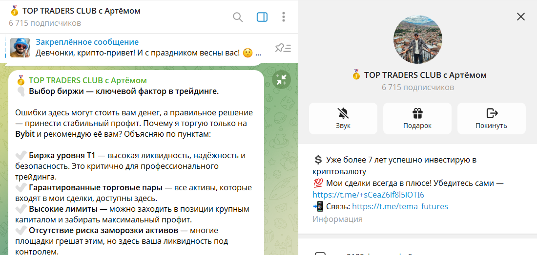 Канал Telegram TOP TRADERS CLUB с Артемом позиционируется как проект о криптотрейдинге. Его ведет трейдер Артем Futures под ником @tema_futures. В ленте публикуют новости рынка и материалы по теме. Основной упор сделан не на обучение, а на торговые идеи. Доступ к сигналам дают в формате «совместной торговли». Прибыль, если она есть, делят между участниками.