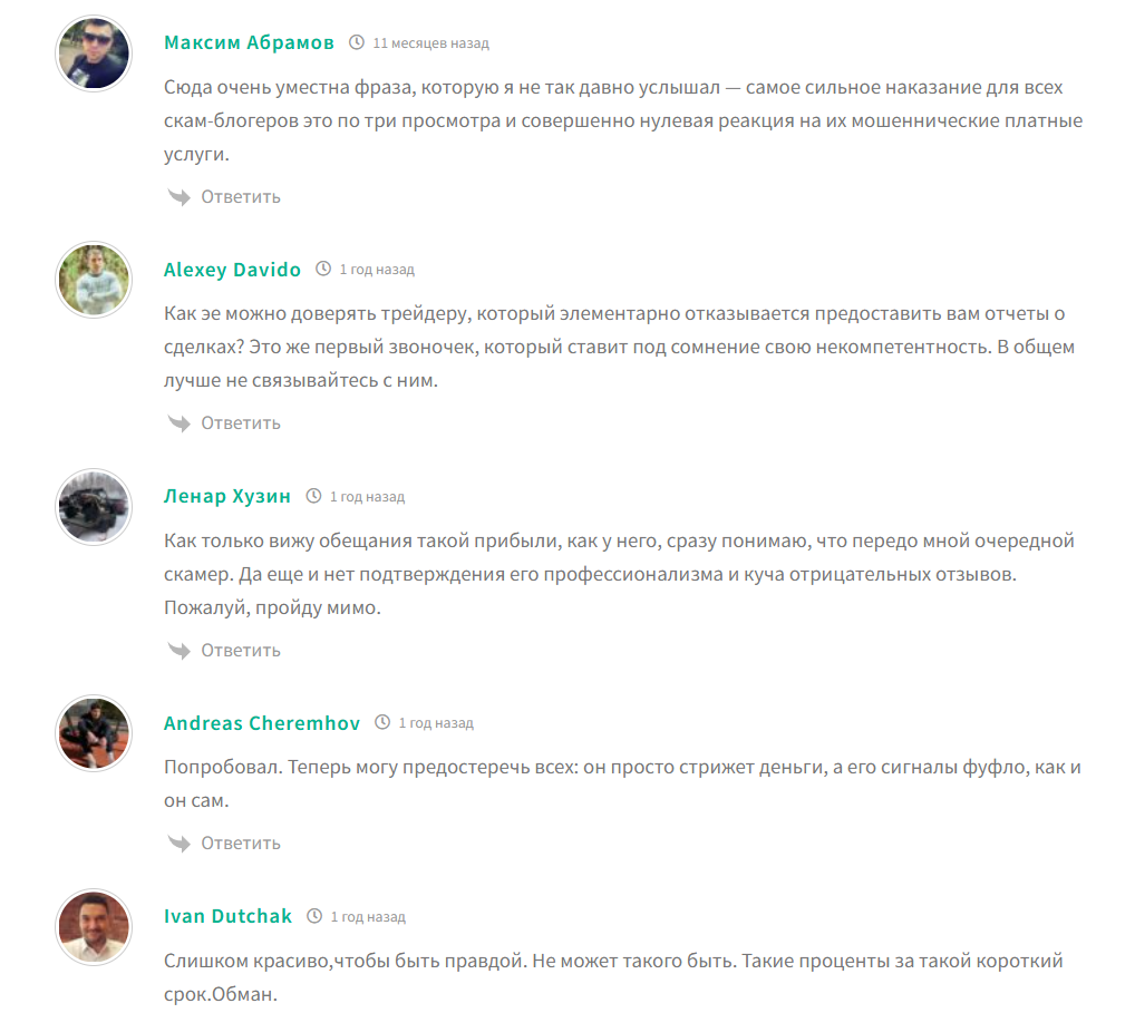 Подтверждаемой, независимой статистики по всем сделкам проекта нет, а значит оценить реальную доходность и просадки невозможно. В качестве доказательств чаще показывают отдельные успешные кейсы и скриншоты, но без общего реестра сделок такие материалы легко отбирать выборочно. Внутри канала можно встретить благодарности, однако на сторонних площадках тональность заметно хуже. В обзорах и комментариях указывают на отсутствие верификации, низкую проходимость и жалобы на потери депозитов: