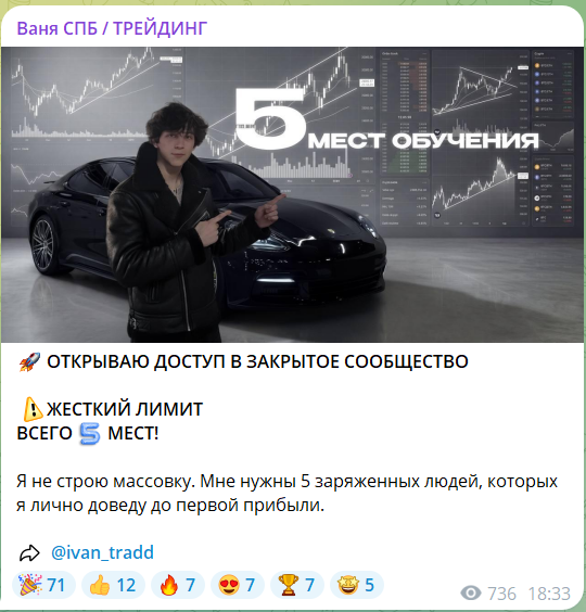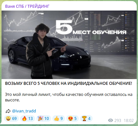 Раз в несколько дней Ваня Трейдер — Питер @ivan_tradd набирает учеников, где обучают торговле бинарными опционами: