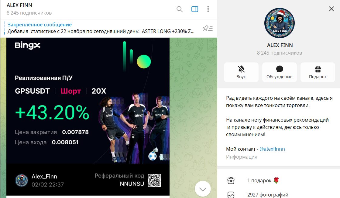 Алекс Финн (аккаунт @alexffinn) представлялся как трейдер, работающий преимущественно с фьючерсами криптовалют. В ленте публикуются сигналы, итоги сделок, а также рекламные материалы и анонсы приватных продуктов. При этом автор оставался анонимным: без подтвержденной биографии, без публичной верификации опыта и без прозрачной демонстрации торговых результатов. В описании обычно делался акцент, что контент – это «мнение автора», то есть ответственность за результат подписчиков фактически снималась заранее.