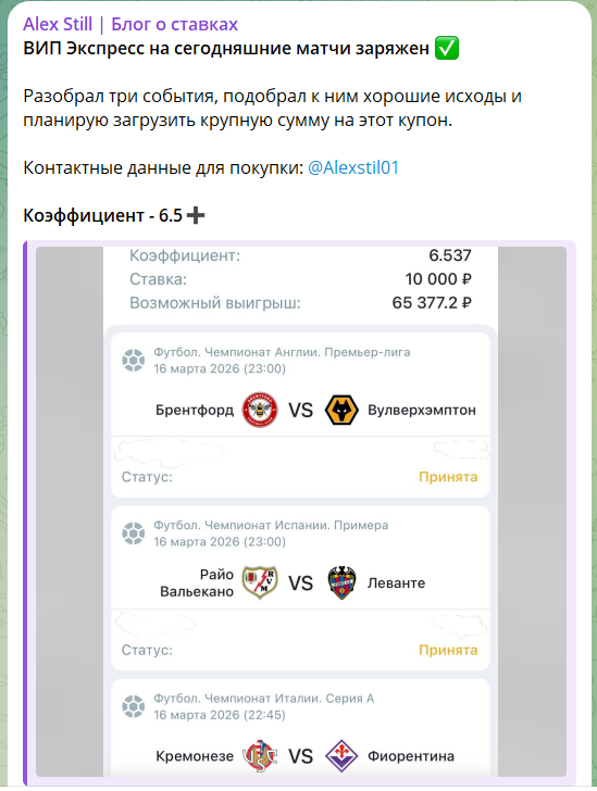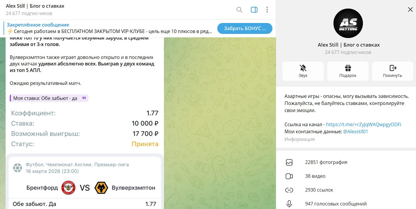 Alex Still | Блог о ставках – телеграмм-канал с прогнозами. Проект позиционируется как сервис с бесплатными советами и платными экспрессами. Основной контент – рекомендации для пари у букмекеров. В ленте регулярно публикуют короткие советы. От любого сотрудничества лучше отказаться, здесь все направлено на слив депозитов, чтобы заработать по партнерской программе букмекера.