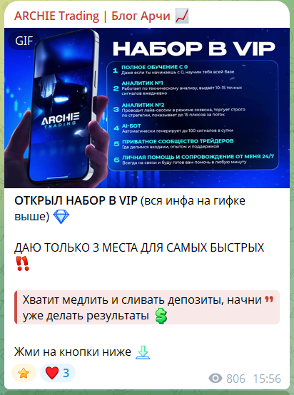 В описаниях проекта ARCHIE Trading | Блог Арчи фигурирует схема, где вход в закрытый чат бесплатной, но есть условия, а именно: