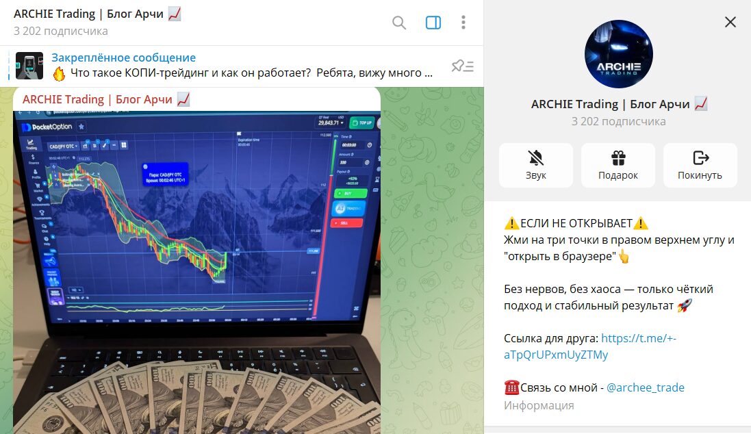ARCHIE Trading | «Блог Арчи» – телеграм проект, посвященный торговле бинарными опционами. Автор позиционирует себя как трейдера с опытом (заявляет о 6 годах в нише), однако ключевые рекомендации и «результаты» в основном переносятся в закрытые форматы: VIP чат и подключение к копитрейдингу. По итогу проверки наши эксперты советуют отказаться от сотрудничества!