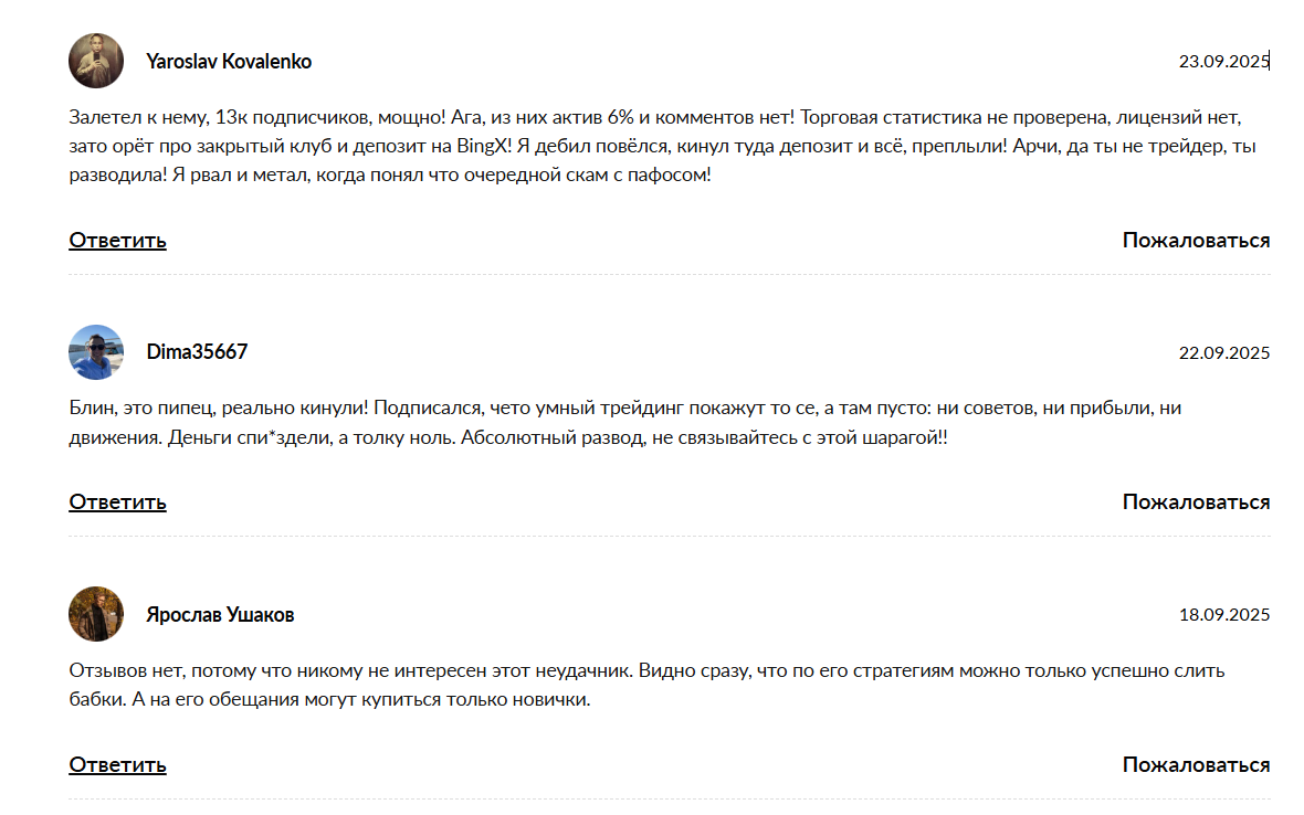 Реальные отзывы. Внутри канала, как правило, показывают положительные отклики (скрины благодарностей), но доверие к ним ограничено из-за закрытых комментариев. На сторонних ресурсах встречаются плохие обзоры и жалоб. Пользователи пишут о недоказанной компетенции, непрозрачности и потерях после подключения/регистрации у рекомендованного брокера: