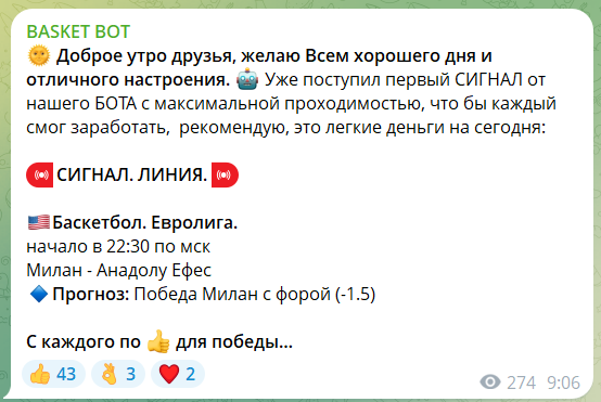 Сообщество посвящено ставкам на баскетбол и был создан недавно — 30.10.2025 года. За короткий срок аудитория выросла до примерно 2.8 тыс. подписчиков, при этом посты получают высокую вовлеченность — порядка 600 просмотров на публикацию. На сервисе отключены комментарии, что лишает подписчиков возможности обсуждать публикации между собой.