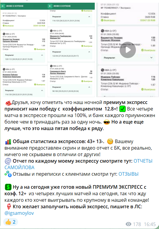 Создатель и руководитель Игорь Самойлов (@igsamoylov) позиционирует себя как аналитик баскетбольных матчей и публикует как бесплатные прогнозы, так и платные предложения. В открытом доступе появляются советы на основные исходы – победы, форы и тоталы – чаще без подробного обоснования: