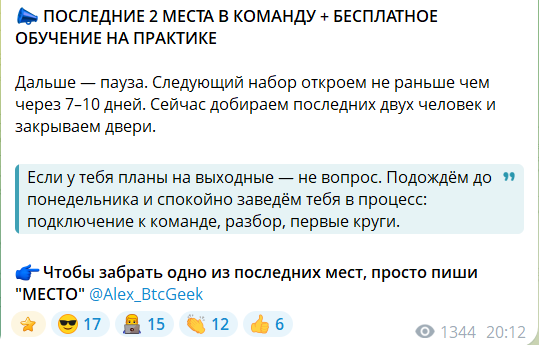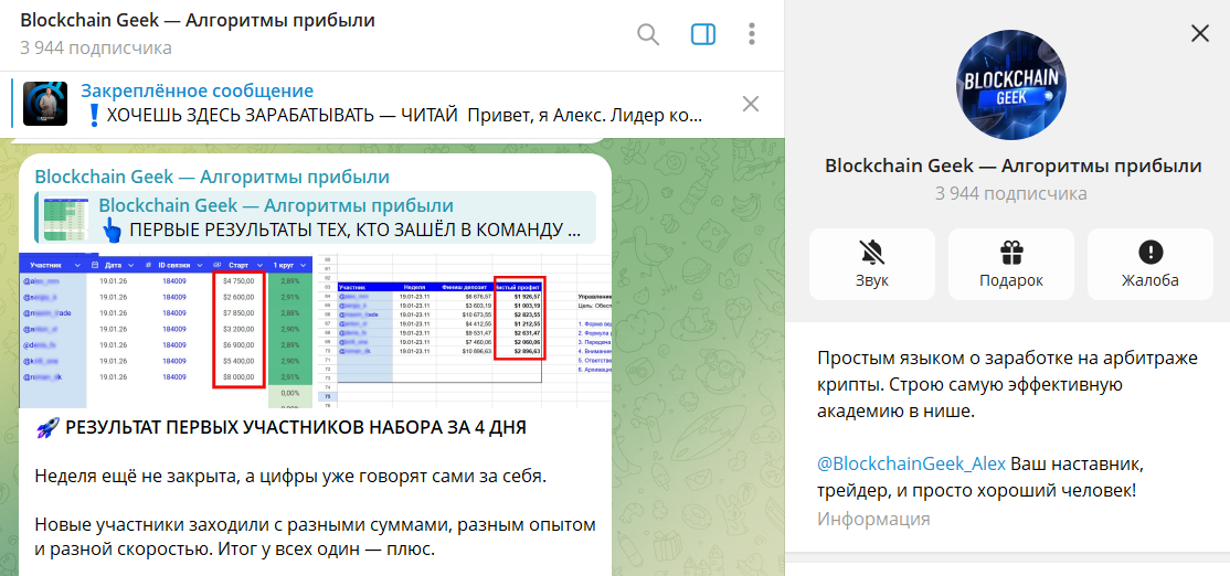 Основной акцент в Telegram-канале «Blockchain Geek | Алгоритмы прибыли» сделан на привлечении клиентов для работы по готовым алгоритмам: