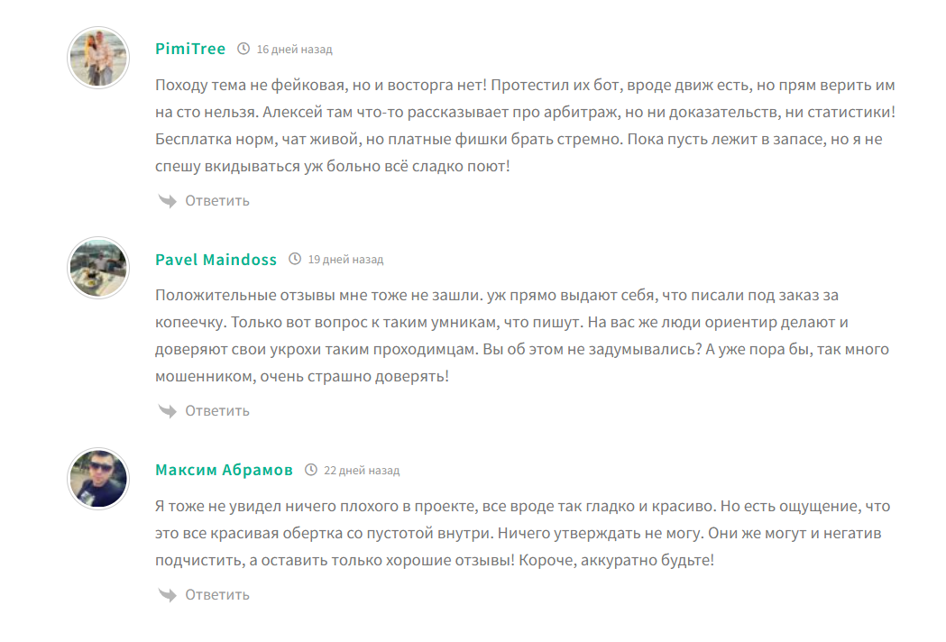 Прозрачная отчетность на проекте отсутствует. Вместо полноценной верифицированной статистики автор демонстрирует лишь скриншоты балансов, которые легко подделать. Свою репутацию Алекс @Alex_BtcGeek повышает переписками с подписчиками, заработавшие приличные деньги на предложенной теме. Мнение участников на сторонних ресурсах отличается – везде исключительно жалобы, примеры: