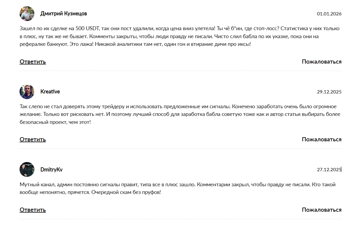 Проект позиционируется как телеграм-канал с сигналами и платными продуктами по криптотрейдингу. При этом ключевой вопрос – доверие к статистике и реальным результатам, так как без независимой верификации любые цифры остаются заявлением автора. Блог молодой, но уже здесь оказывают неоднозначные услуги по раскрутке и скрывают все убыточные сделки. На сегодня от любого сотрудничества лучше отказаться, свой отзыв о группе можно оставить в наших комментариях!