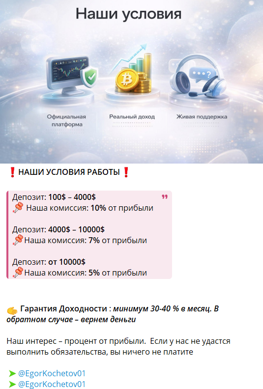 На проекте в телеге Blockchain Syndicate оказывают довольно сомнительную услугу по раскрутке депозитов. Трейдер Егор Кочетов (@EgorKochetov01) обещает своим клиентам довольно высокую процентную ставку: