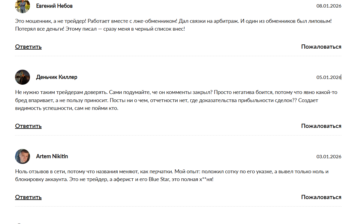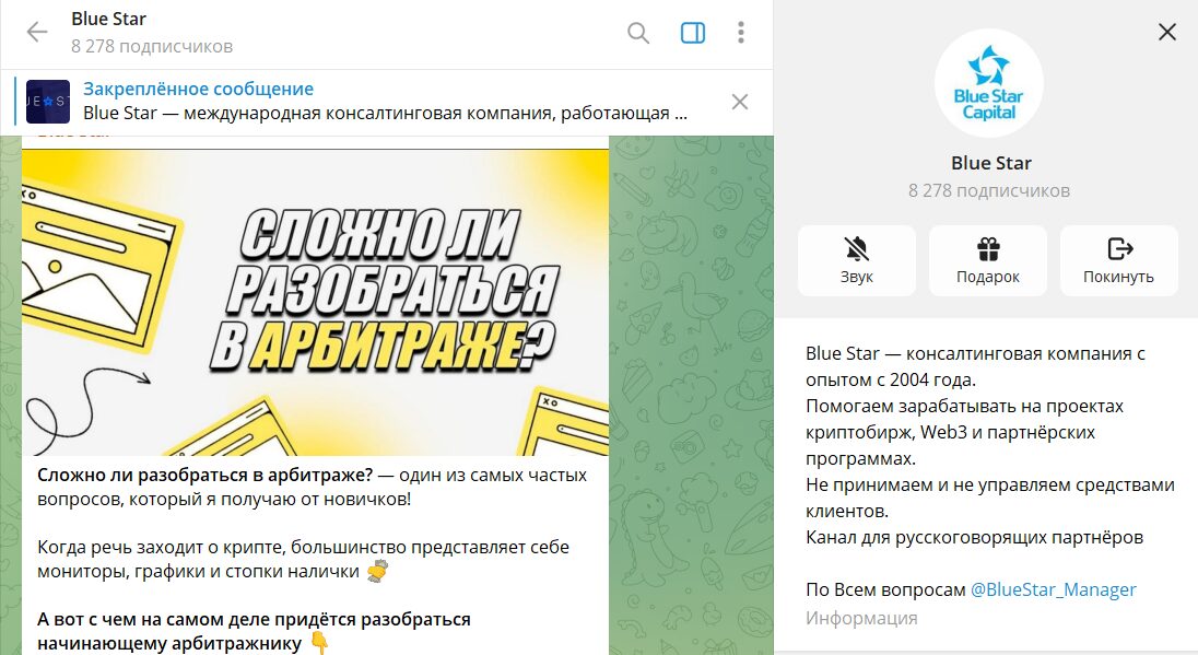 Проект Blue Star (ранее известный как Capital Code) позиционируется как телеграм-канал про криптоарбитраж, где трейдер Артем BlueStar_Manager обещает обучать новичков и выдавать «готовые связки» без оплаты. На словах это выглядит привлекательно: вход с небольшим депозитом, понятный алгоритм действий и «поддержка наставника», но на деле, не все так сложно. От всех даже самых выгодных предложений наши эксперты рекомендуют отказаться!