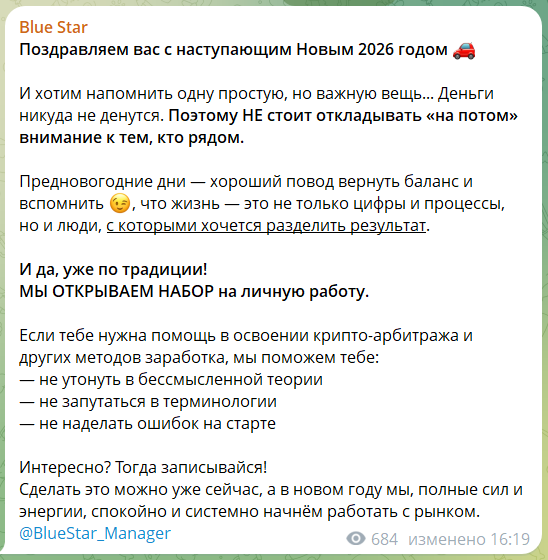 На телеграмм канале Blue Star механика выглядит стандартно для подобных проектов – пользователь подает заявку через менеджера BlueStar Manager, после чего ему обещают «тестовую связку» и доступ к дальнейшим материалам. Часто дополнительно озвучивается необходимость созвона с «наставником», чтобы объяснить порядок действий.