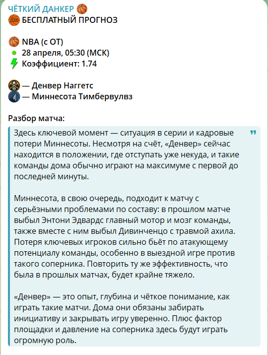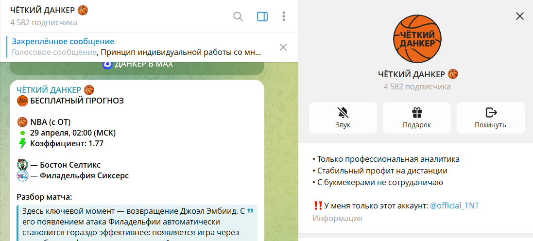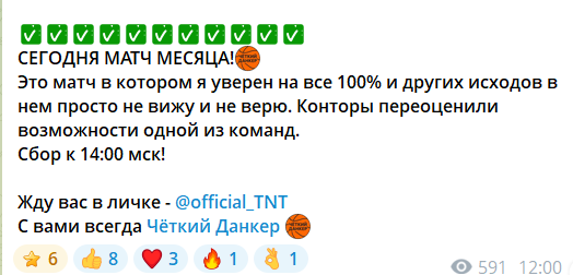 Проект Четкий Данкер позиционирует себя как надежный источник аналитики на баскетбольные матчи, привлекая внимание аудитории качественным оформлением и ставками на крупные рынки. На первый взгляд, кажется, что каппер Данкер @official_TNT проводит глубокую работу, сопровождая каждый совет подробным текстовым разбором игровых моментов. Читателей подкупает логика изложения и выбор популярных лиг, что создает иллюзию профессионализма, и честности со стороны администратора канала.