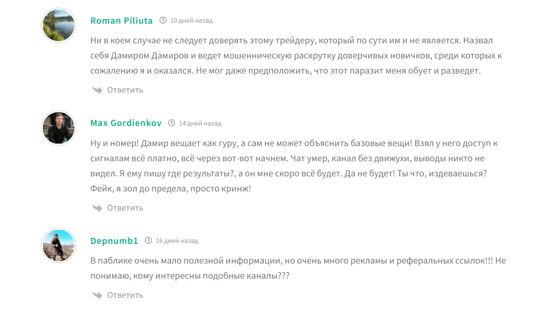 Все финансовые рынки сопряжены с огромными рисками, особенно бинарные опционы и ФОРЕКС. Складывается ситуация, что в 99% случаев на проектах сигналами подписчикам намеренно сливают депозиты, чтобы получить доход от рекламируемой торговой платформы. Сегодня в нашем обзоре проект трейдера Дамира Дамирова, который ведет деятельность на каналах Telegram и YouTube. О ходе проверки далее.
