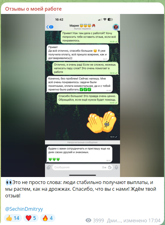 У автора существует отдельный канал под названием «Отзывы о моей работе». Там размещены исключительно положительные комментарии, и даже видеоролики от довольных подписчиков. Все восторгаются честностью, оперативностью выплат, простотой заданий. Картинка идеальная: