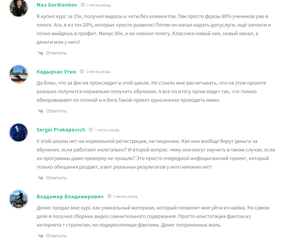 На собственных площадках проекта fck-academy com (Finance Crypto Knowledge) чаще демонстрируются положительные отзывы. Это распространенная практика: администратор публикует только выгодные сообщения, а отрицательные не появляется из-за модерации или закрытых комментариев. При этом на независимых ресурсах, чаще встречаются жалобы. Пользователи пишут о слабой ценности контента и обвиняют проект в инфопродаже без доказательств эффективности: