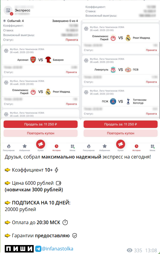 Подобные сообщества нужно избегать, в противном случае со своими деньгами можно попрощаться. Такие каналы рассчитаны на новичков, которые ничего не понимают в беттинге – им легче всего «навешать лапши».