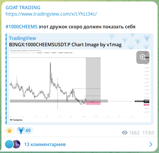 Аналитик Дмитрий (goatloveceo) выдает свои мысли по долгосрочным и краткосрочным инвестициям. Бесплатные сигналы по фьючерсному рынку криптовалют на канале GOAT TRADING в Телеграм выходят на постоянной основе. Часть рекомендаций с описанием, другая – без обоснования: