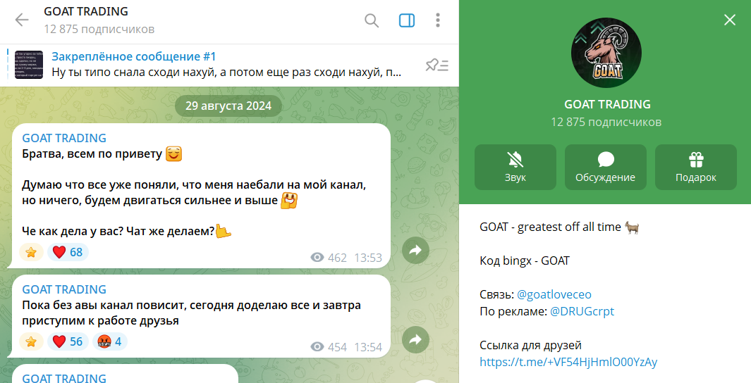 Более или менее честные ресурсы на тему крипты встречаются довольно редко. Обычно владельцы преследуют только цели собственной выгоды, и им неважно, что подписчики получают на выходе. При проверке канала TG GOAT TRADING в работе трейдера Дмитрия (goatloveceo) сомнительные действия не выявлены. Ресурс может быть полезен большой аудитории, единственный момент, общая статистика не ведется, а люди в интернете оставляют плохие отзывы, хотя сайты размещения неоднозначные.