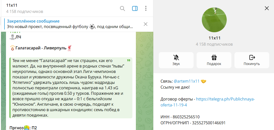 Канал Telegram 11х11 – это проект со ставками на футбол. Его ведет каппер Артем под ником @artem11x11. Площадка оформлена как аналитический ресурс с прогнозами. В ленте сочетаются бесплатные советы и платные предложения. Акцент делается на популярные футбольные турниры. Проект продвигается через закупку рекламы и взаимопиар. Анализ показал, что заявленные результаты не вызывают доверия.