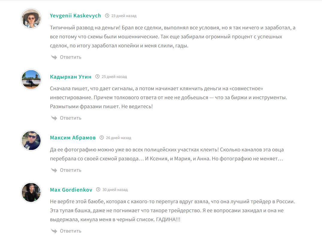Открываем независимые площадки для отзывов – о канале в телеграмме Ксения live @ksu_hrusha1 вырисовывается совсем другая картина. Сотни жалоб от реальных людей. Потеряли 5 тысяч, 50 тысяч, есть истории о сотнях тысяч. Люди пишут с болью, предупреждают других: