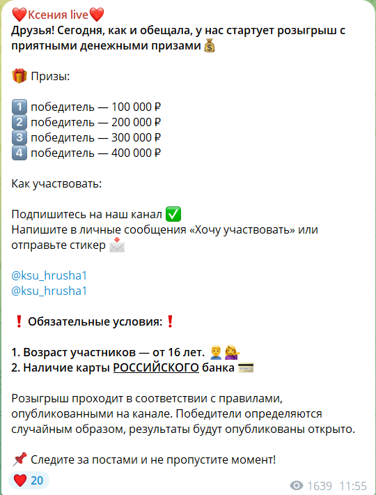 Канал Ксения live (@ksu_hrusha1) каждый день проводит конкурсы с призами до 400 тысяч рублей. Обещают простые условия и стопроцентные выплаты. Реальность жестче: никто ни копейки не получил, зато сотни людей потеряли от тысяч до сотен тысяч рублей на «комиссиях» и «налогах».