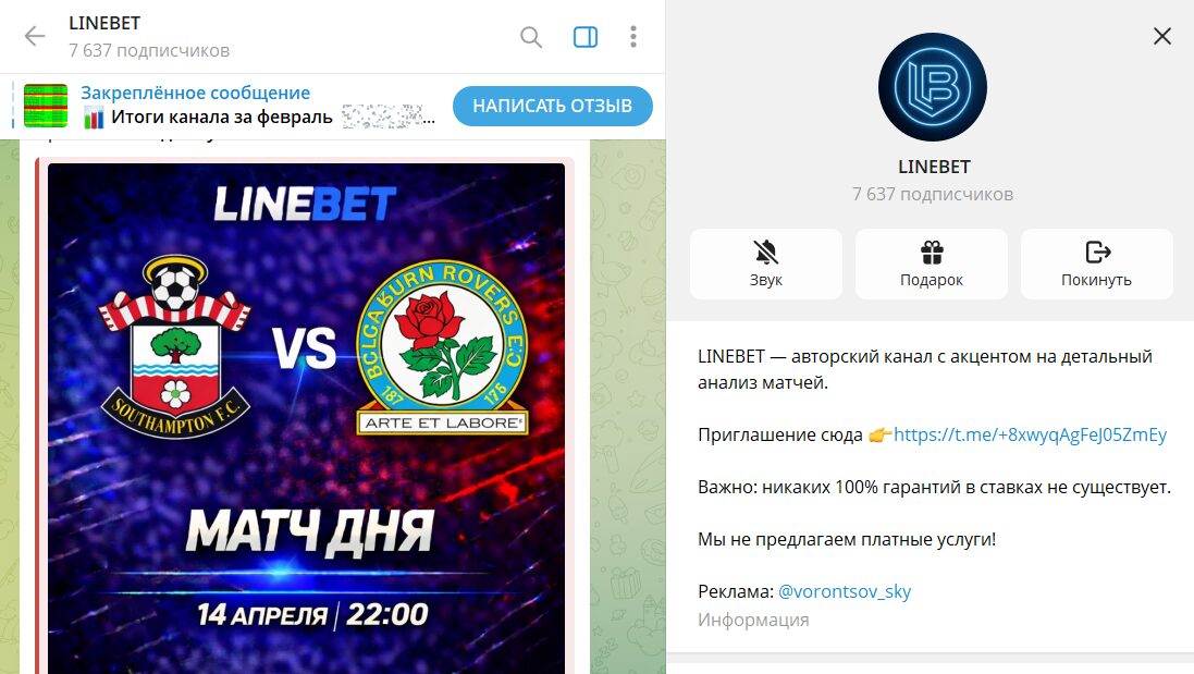 Канал Telegram LINEBET – это проект о ставках на спорт, который ведет каппер Дима Воронцов (@vorontsov_sky). В ленте публикуют прогнозы на футбол и теннис. Основной акцент делают на быстрые результаты и «легкие» деньги. Контент подается уверенно, но без прозрачной отчетности. Для новичков такой формат выглядит убедительно. На практике риски для банка здесь максимальные.