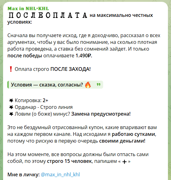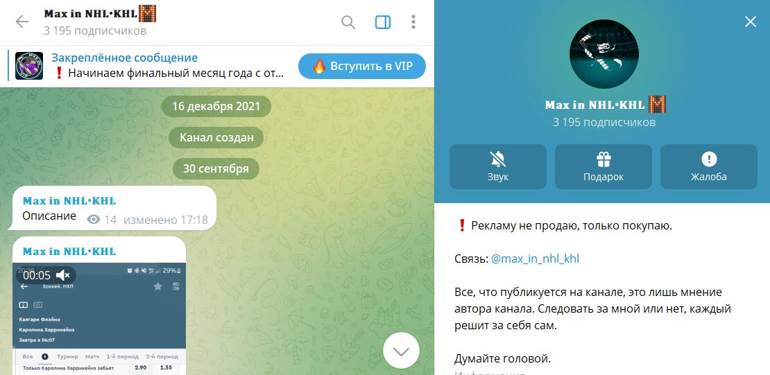 Прогнозисты с аналитических ресурсов в 99% заботятся только о своем благополучии. Зачастую выставленные условия работы даже при качественном анализе и высоком проходе приводят к сливу игрового банка у подписчиков. Сегодня в обзоре у нас канал Max in NHL KHL в телеграме с бесплатными и платными ставками для заключения пари в букмекерской конторе. Анализ показал, что заявленной статистике и отзывам нет никакого доверия. Об этом далее подробно!