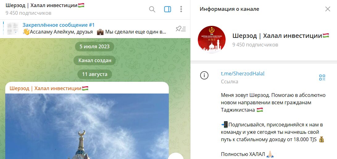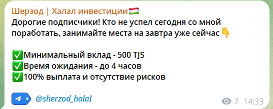 На канале ТГ Шерзод | Халал инвестиции каждый день набирают клиентов. Допускаются люди с балансами от 500 TJS, с такого депозита средняя выплата составляет 15000-24000+: