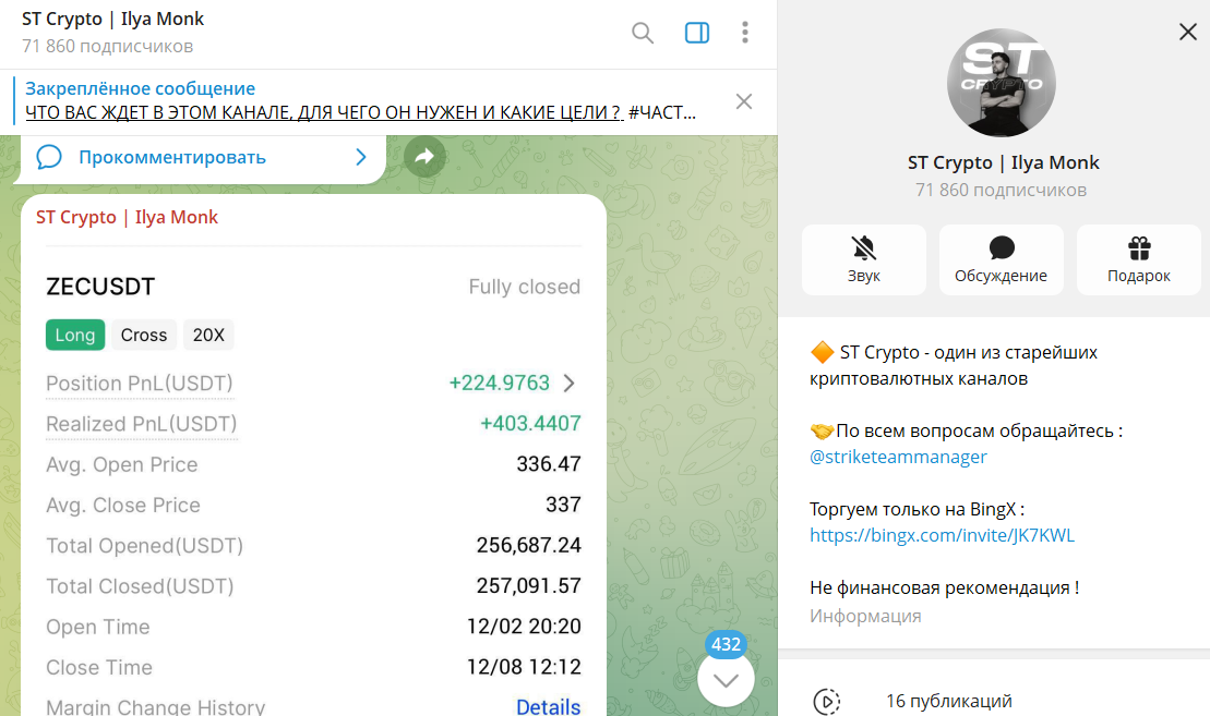 По описанию – это блог о фьючерсной торговле криптовалютами. Аудитории обещают бесплатные прогнозы и сигналы, а также возможность получить больше рекомендаций через VIP формат. При этом личности трейдеров не раскрываются – коммуникацию ведет менеджер. На канале 71 тыс. человек, а просмотров за сутки всего 1 тыс., то есть, живых здесь не более 15%. В открытых комментариях сообщений мало.