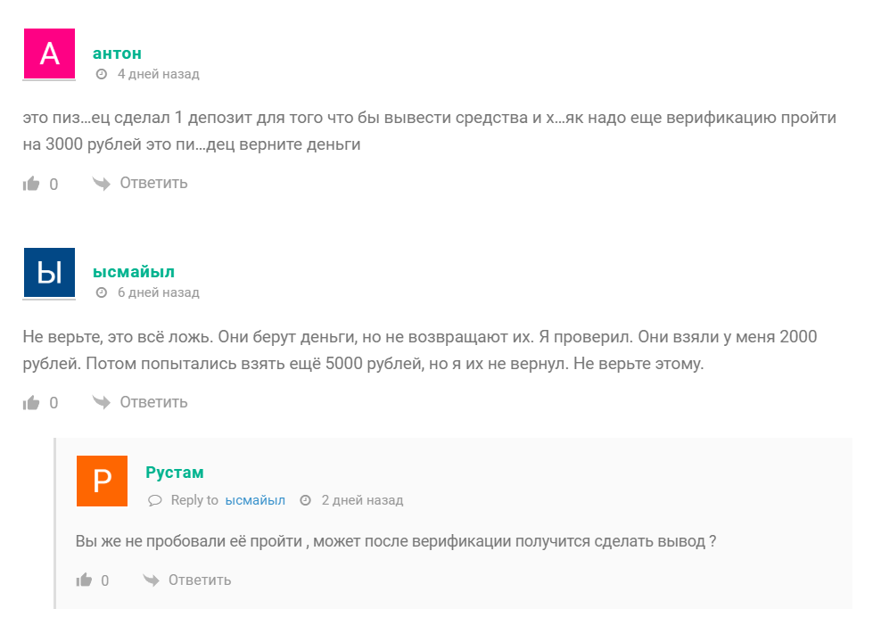 В обзорах и отзывах описывается типичный сценарий. Пользователь набирает 10000 на балансе и отправляет заявку на вывод. После этого начинаются требования. Первое — внести депозит для подтверждения личности. Условная стандартная процедура. Сумма может быть разной — 500-1000 рублей.
