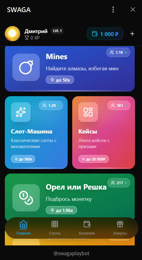 Информация о компании полностью отсутствует. Нет юридических данных, контактов реальных лиц. Только ник в Telegram @swagaplaybot. Лицензии на проведение азартных игр тоже нет. При этом бот оформлен качественно. Когда запускаешь мини-приложение, видишь игровой кошелёк с балансом, кнопки пополнения и вывода, разделы с играми. Прилично для сервиса, работающего вне правового поля.