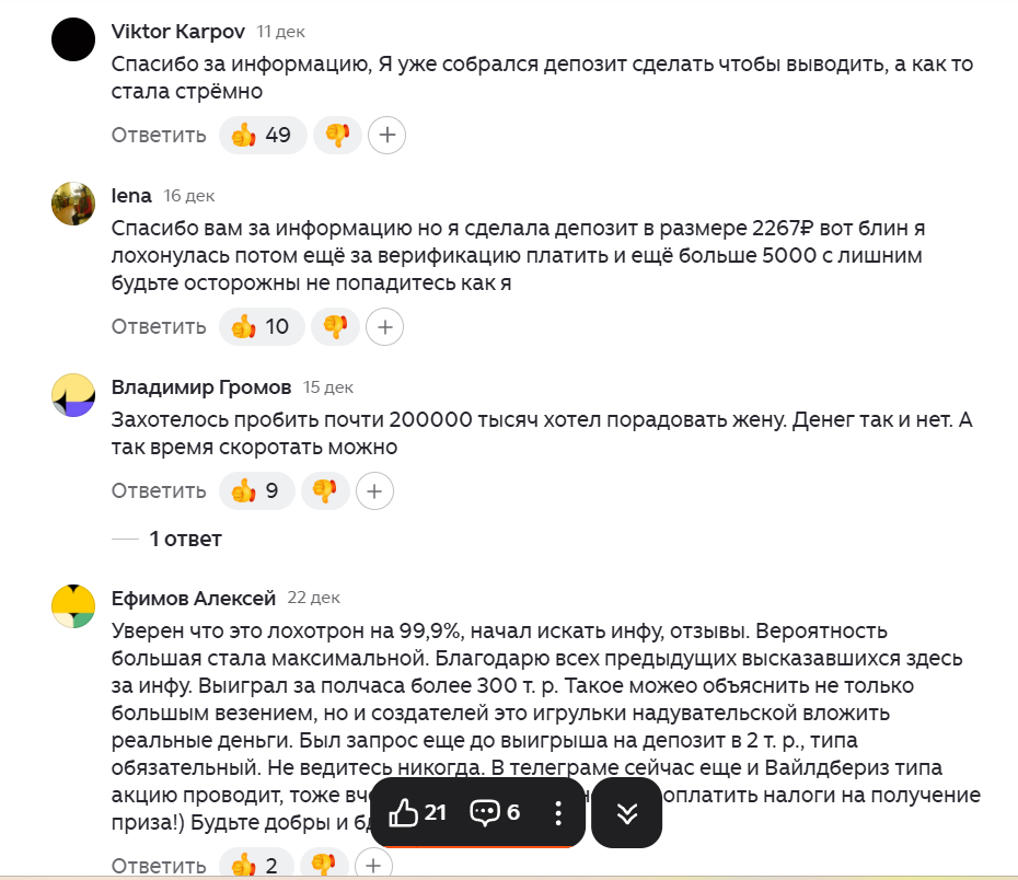 Официального канала у бота нет. В самом приложении отзывы не публикуются. На антискам-порталах информации больше. О приложении СВАГА везде опубликованы негативные отклики. Пользователи описывают похожие ситуации: легкий выигрыш на старте, невозможность вывести средства, требования дополнительных платежей: