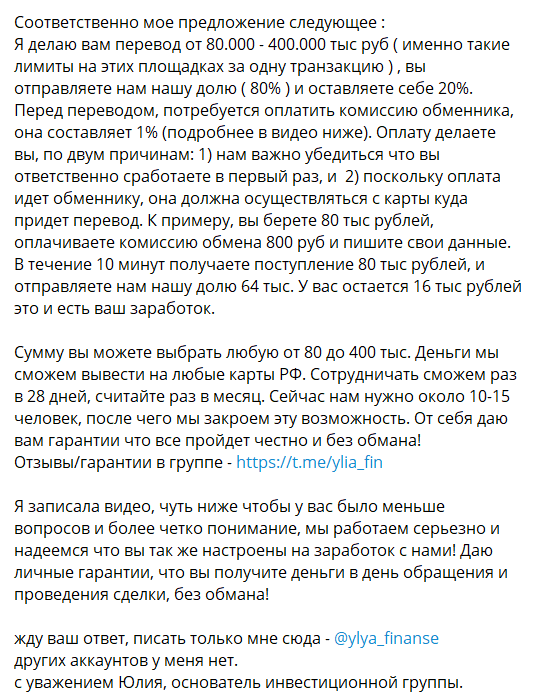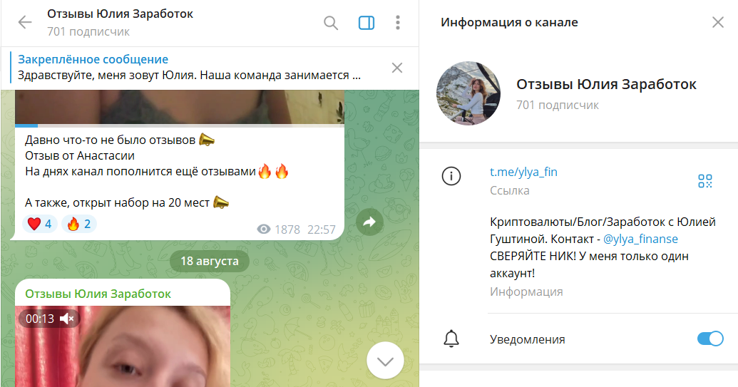 Проект Юлия Заработок посвящен инвестициям в крипту. По легенде трейдер Гуштина @ylya_finanse выводит деньги с заблокированных российских счетов бирж, а для увеличения оборота привлекает сторонних людей. На деле девушка оказалась очередной мошенницей с услугами по раскрутке депозитов.От любого взаимодействия и выгодных предложений по получению дохода рекомендуем изначально отказаться!