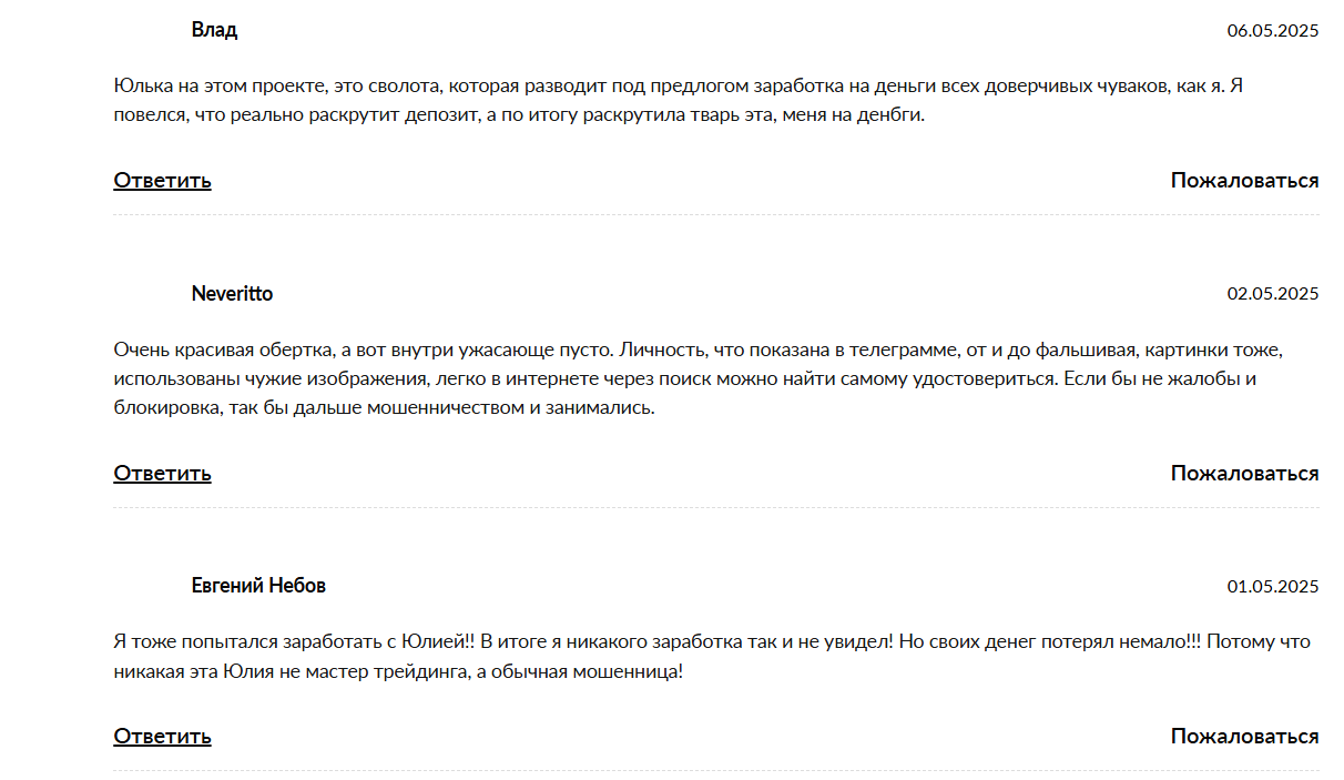 У себя на ресурсе Юлия Гуштина @ylya_finanse на постоянной основе публикует видеоролики, которые записывают клиенты. Все остаются довольны полученными заработками. В данном случае стоит знать, что видео ненастоящие, а 100% липа, покупающая на фрилансерских биржах. Объективную оценку можно найти на многих сторонних независимых сервисах, где нашу особу называют мошенницей: