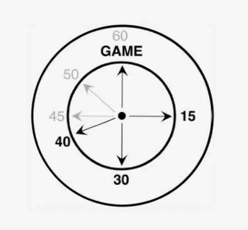 Согласно теории четверти часов, странная система подсчета очков могла появиться из очень практичного способа фиксировать прогресс – по кругу, как на часах. Логику легко представить: чтобы выиграть гейм, нужно взять четыре очка, значит удобно разбить «круг» на четыре части. Тогда первое очко – 15 минут, второе – 30 минут, третье – 45 минут, а 60 означало завершение гейма.