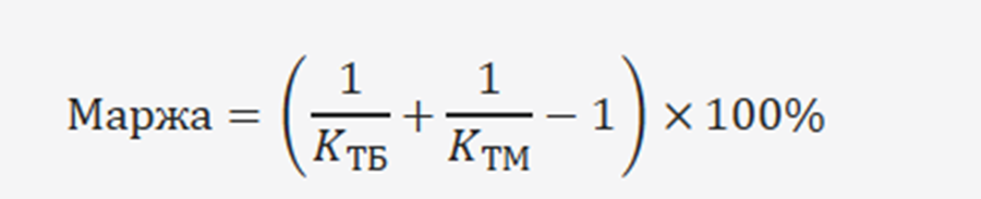 Затем включается маржа букмекера: сумма «вшитых» вероятностей становится больше 1 (или 100%). Для двух исходов маржу удобно считать так: